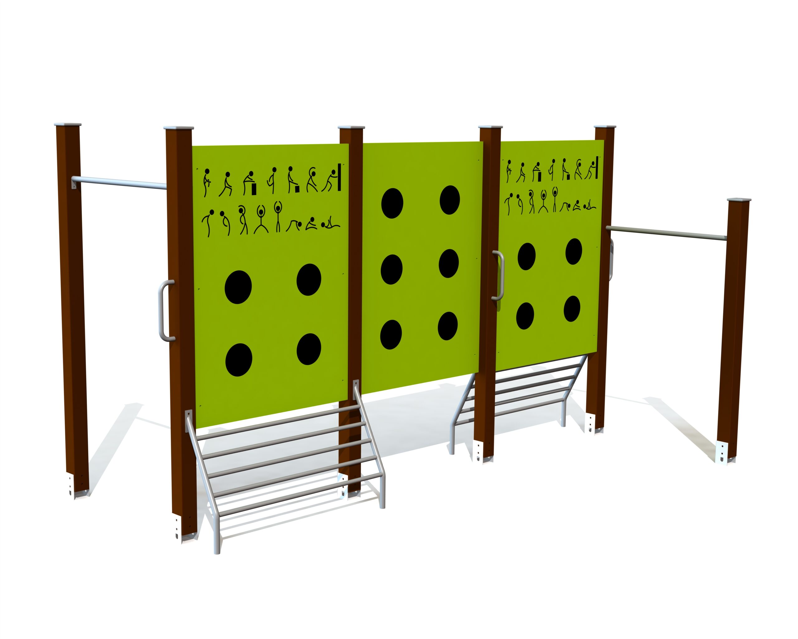 Sträckande och hängande vägg bestående av flera olika tränings- och stretchelement. Levereras med bruksanvisning och är avsedd för rörlighets- och kroppsviktsträning.