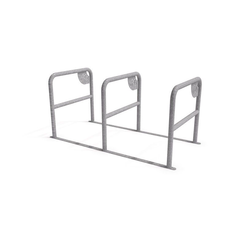 Stålcykelställ för 6 cyklar. Består av tre U-formade bågar med skylt och två flatjärn. Justerbart 45–90°.