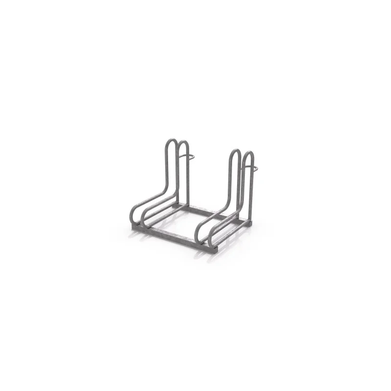 Stål cykelställ för 2 bikes. 2 L-shaped mountings för wheels connected by bottom stål profile.