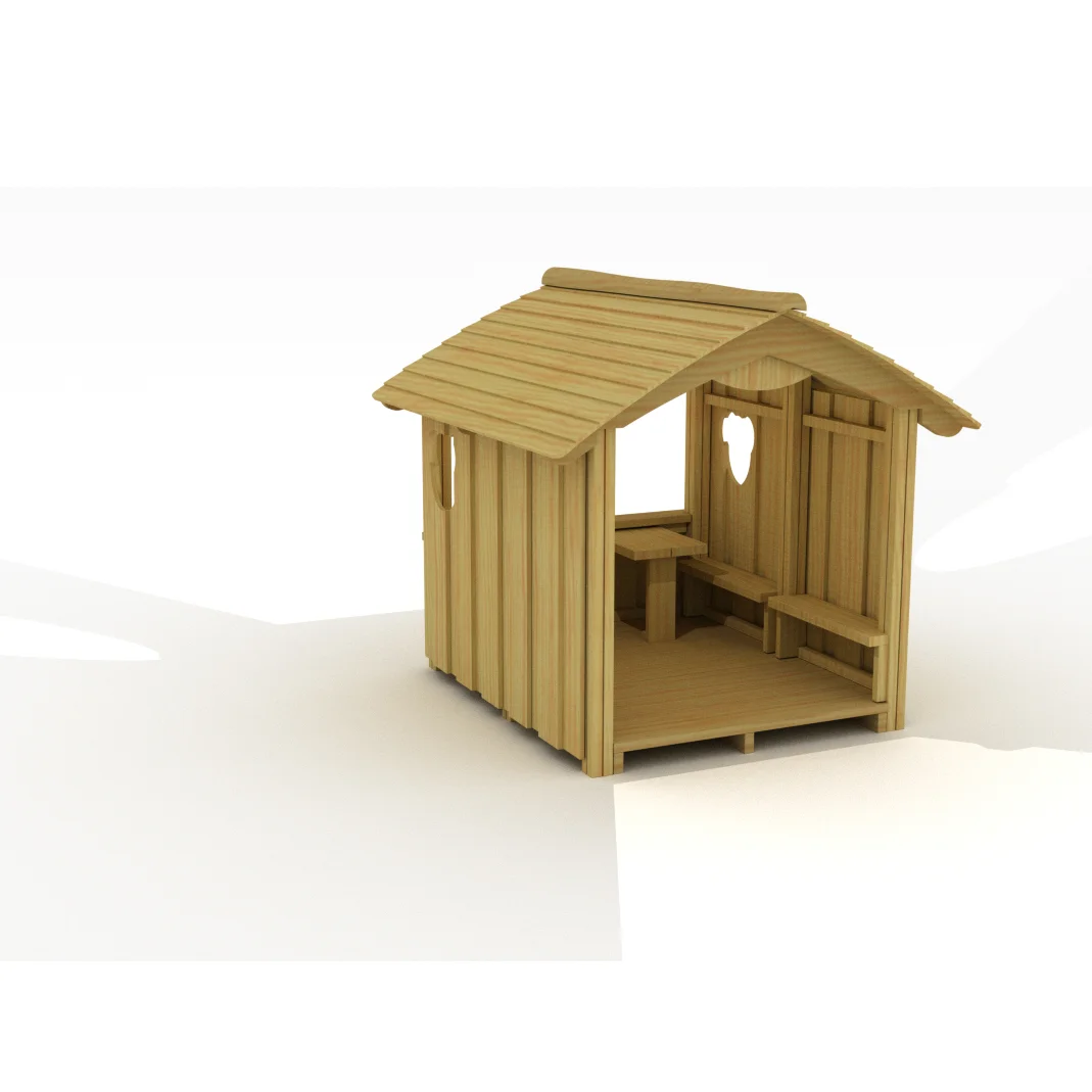 Stort björnhus med golv. Lekstugan har bänkar längs sidorna och ett litet bord i mitten. Ena änden är öppen, som vår SKU 5010. Lekstugan har följande mått: 190x162xH192 cm. T…