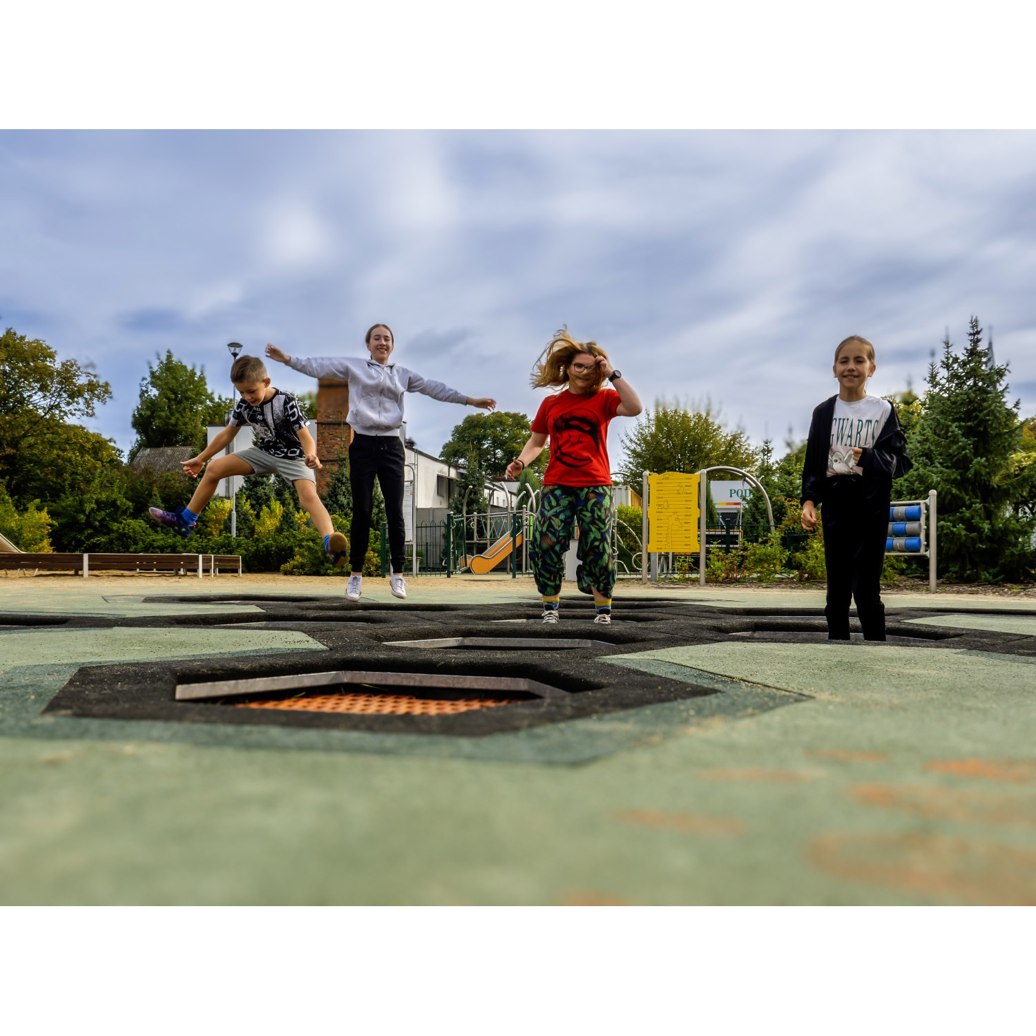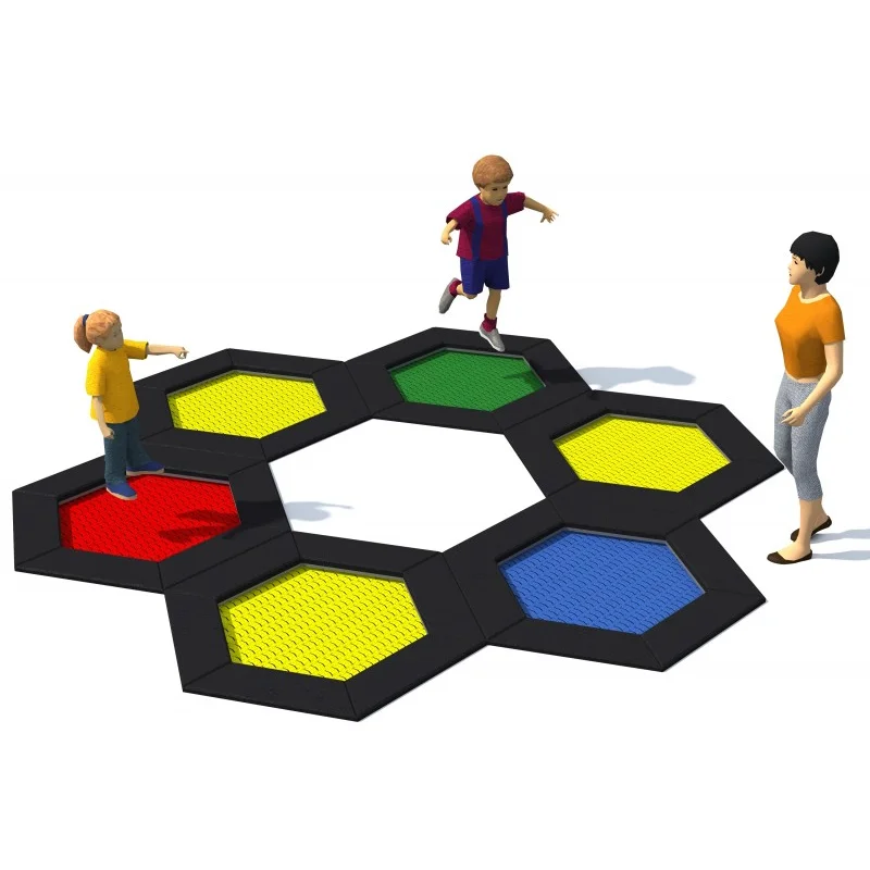 Set med 6 sexkantiga (bikakeformade) studsmattor avsedda för intensiv användning på lekplatser. Hoppmattorna är uppbyggda av slitstarka Hercules-lameller med 37 mm bredd, V-form och förstärkta ribbor. Lamellavståndet på 7 mm ökar säkerheten genom att förhindra att små föremål faller ner. Mattorna finns i 8 färger och kan anpassas med grafik. Trampolinkragen finns i 2 standardfärger och 23 specialfärger samt kan dekoreras. Studsmattorna kan utrustas med öppningsbart lock. Garantin omfattar 25 år för metalllåda och 3 år för lameller.