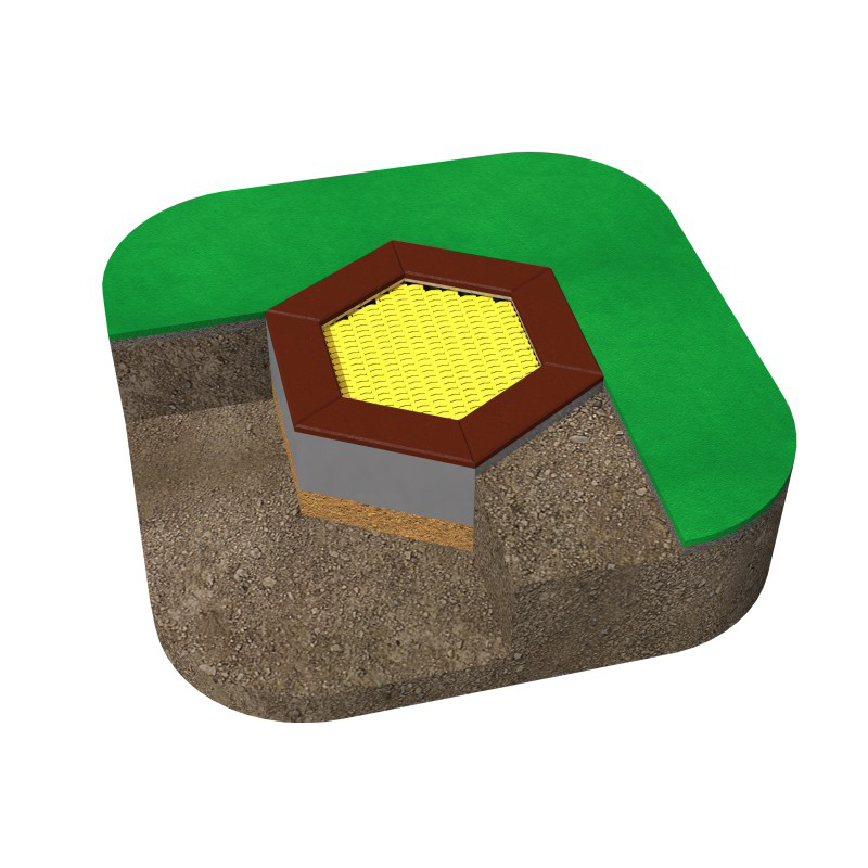 Hexagonal (bikakeformad) studsmatta med ambulansmönster på hoppmattan, avsedd för intensiv användning på lekplatser. Hoppmattan är tillverkad av mycket slitstarka Hercules-lameller med 37 mm bredd, V-form och förstärkta ribbor. Avståndet mellan lamellerna är endast 7 mm, vilket förhindrar att små föremål faller ner i studsmattan. Hoppmattan har en bild av en ambulans och är uppbyggd av lameller i grå, gul, röd, ljusblå och blå färg. Studsmattan kan utrustas med öppningsbart lock för enkel rengöring. Garantin omfattar 25 år för metalllåda och 3 år för lameller.