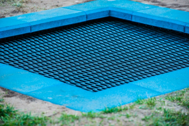 Studsmatta för offentlig utemiljö med robust konstruktion för säker hopplek och hög belastning.