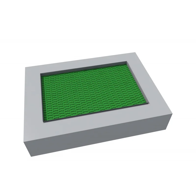 Rektangelformad studsmatta avsedd för intensiv användning på lekplatser med våt hällyta. Hoppmattan är tillverkad av mycket slitstarka Hercules-lameller med 37 mm bredd, V-form och förstärkta ribbor. Lamellavståndet på endast 7 mm förhindrar att små föremål faller ner. Mattan finns i 8 färger och kan även förses med grafik. Studsmattan saknar gummikrage. Garantin omfattar 25 år för metalllåda och 3 år för lameller.