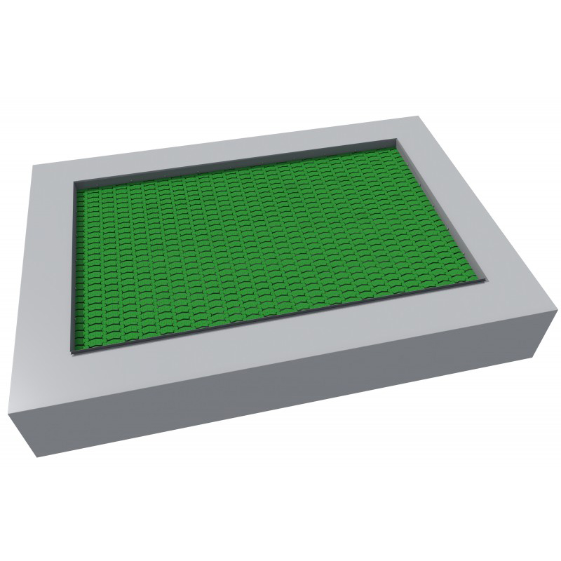 Rektangelformad studsmatta avsedd för intensiv användning på lekplatser med våt hällyta. Hoppmattan är tillverkad av mycket slitstarka Hercules-lameller med V-form och förstärkta ribbor. Avståndet mellan lamellerna är endast 7 mm, vilket förhindrar att små föremål faller ner. Mattan finns i 8 färger och kan förses med grafik. Denna modell saknar gummikrage. Garantin omfattar 25 år för metalllåda och 3 år för lameller.