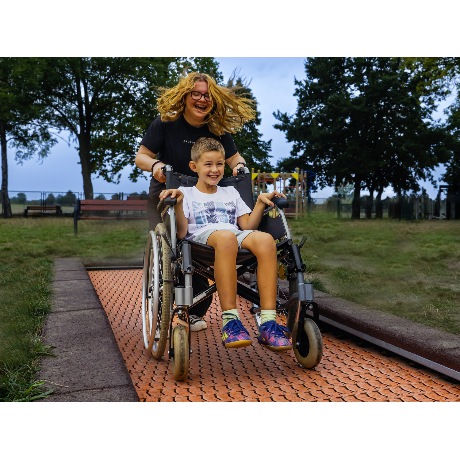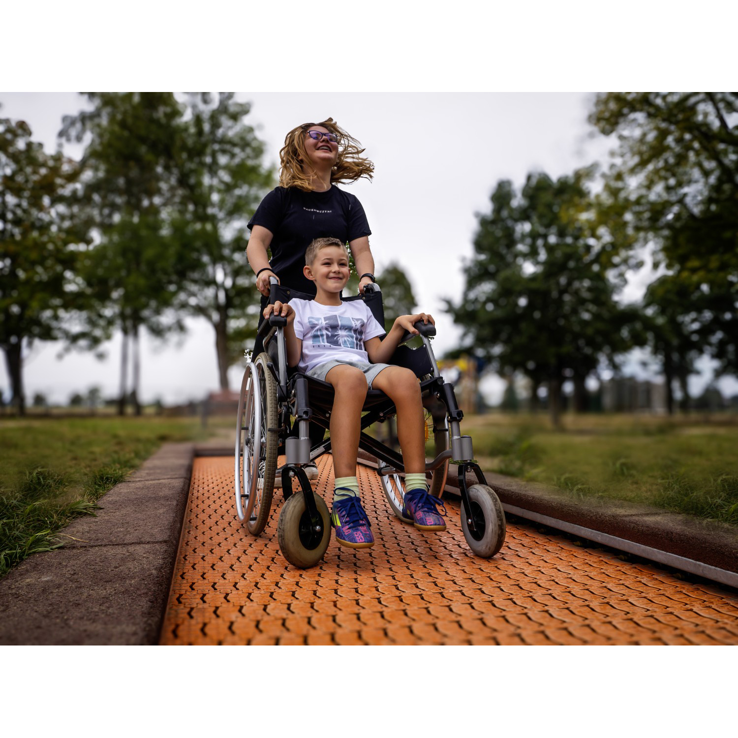 Rektangulär studsmatta med fyrmönster på hoppmattan, anpassad för personer i rullstol och avsedd för intensiv användning. Hoppmattan är tillverkad av mycket slitstarka Hercules-lameller med V-form och förstärkta ribbor. Avståndet mellan lamellerna är endast 7 mm, vilket förhindrar att små föremål faller ner. Mattan är uppbyggd av lameller i gul, svart, grön, ljusblå, röd och blå färg. Gummikrage och profilerad in- och utgång är anpassade för rullstolsanvändning. Studsmattan kan utrustas med öppningsbart lock. Garantin omfattar 25 år för metalllåda och 3 år för lameller.