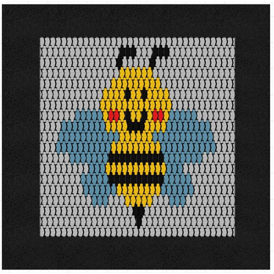 Fyrkantig studsmatta med bimönster på hoppmattan, avsedd för intensiv användning på lekplatser. Hoppmattan är tillverkad av slitstarka Hercules-lameller med V-form och förstärkta ribbor. Lamellavståndet på 7 mm förhindrar att små föremål faller ner. Mattan är uppbyggd av lameller i svart, rött, gult, ljusblått och grått. Studsmattan kan utrustas med öppningsbart lock. Garantin omfattar 25 år för metalllåda och 3 år för lameller.