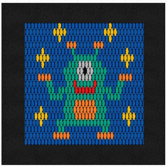 Fyrkantig studsmatta med rymdvarelsemönster på hoppmattan, avsedd för intensiv användning på lekplatser. Hoppmattan är uppbyggd av mycket slitstarka Hercules-lameller med 37 mm bredd, V-form och förstärkta ribbor. Avståndet mellan lamellerna är endast 7 mm, vilket förhindrar att små föremål faller ner. Mattan består av lameller i blå, svart, röd, grön, gul, orange och grå färger. Studsmattan kan utrustas med öppningsbart lock. Garantin omfattar 25 år för metalllåda och 3 år för lameller.