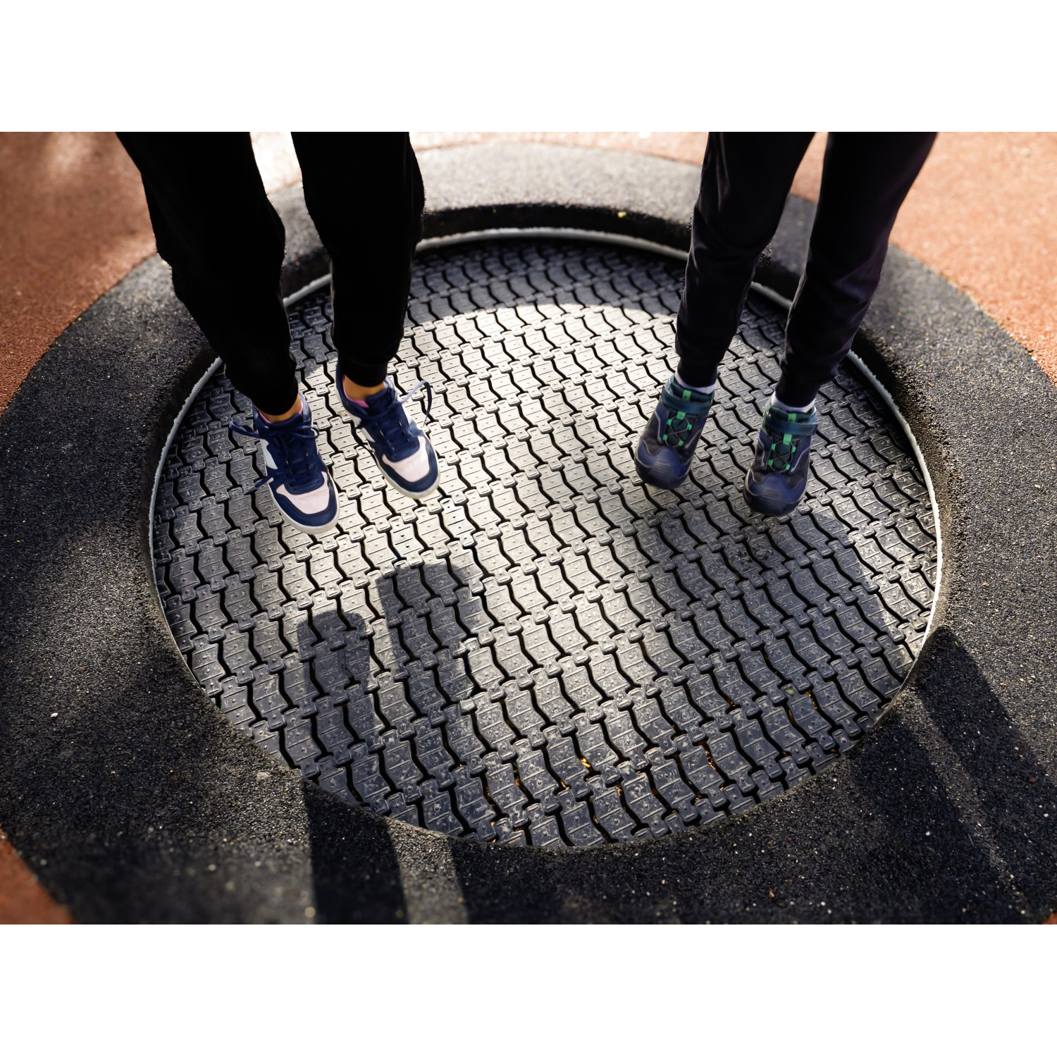 Rundformad studsmatta utvecklad för intensiv användning. Hoppmattan består av slitstarka Hercules-lameller med en minsta bredd på 37 mm, V-formad konstruktion och förstärkta ribbor. Avståndet mellan lamellerna är endast 7 mm för ökad säkerhet. Mattan finns i 8 färger och kan även anpassas med grafik. Gummikragen finns i 2 standardfärger samt 23 specialfärger och kan dekoreras med mönster. Studsmattan kan förses med öppningsbart lock för enkel rengöring. Garantin omfattar 25 år för metalllådan och 3 år för lamellerna.