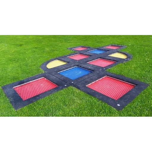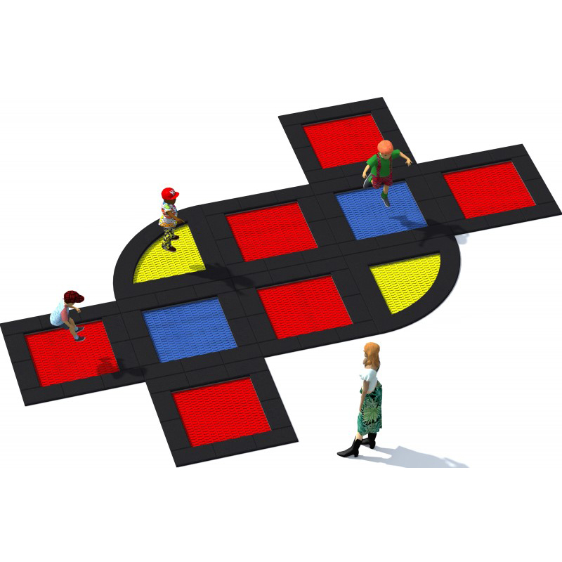 Set med 10 studsmattor för intensiv användning på lekplatser. Setet består av 8 fyrkantiga studsmattor och 2 kvartsformade studsmattor. Hoppmattorna är tillverkade av slitstarka Hercules-lameller med V-formad konstruktion och förstärkta ribbor. Lamellavståndet på endast 7 mm ökar säkerheten. Mattorna finns i 8 färger och kan anpassas med grafik. Trampolinkrage finns i flera färgalternativ. Studsmattorna kan förses med öppningsbart lock. Garantin omfattar 25 år för metalllådor och 3 år för lameller.