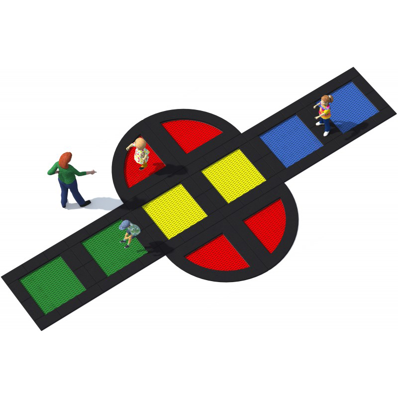 Set med 10 studsmattor avsedda för intensiv användning. Setet består av 6 fyrkantiga studsmattor och 4 kvartsformade studsmattor. Hoppmattorna är tillverkade av slitstarka Hercules-lameller med V-formad konstruktion och förstärkta ribbor. Lamellavståndet på 7 mm förhindrar att små föremål faller ner. Mattorna finns i 8 färger och kan anpassas med grafik. Trampolinkrage finns i flera färger. Studsmattorna kan utrustas med öppningsbart lock. Garantin omfattar 25 år för metalllådor och 3 år för lameller.