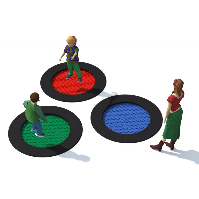 Set med 3 studsmattor avsedda för intensiv användning på lekplatser. Setet består av 3 runda studsmattor. Hoppmattorna är tillverkade av slitstarka Hercules-lameller med en minsta bredd på 37 mm, V-formad konstruktion och förstärkta ribbor. Tack vare lamellavstånd på endast 7 mm förhindras att små föremål faller ner. Mattorna finns i 8 färger och kan även anpassas med grafik. Trampolinkragen finns i 2 standardfärger och 23 specialfärger samt kan dekoreras med mönster. Studsmattorna kan förses med öppningsbart lock för enkel rengöring. Garantin omfattar 25 år för metalllådor och 3 år för lameller.