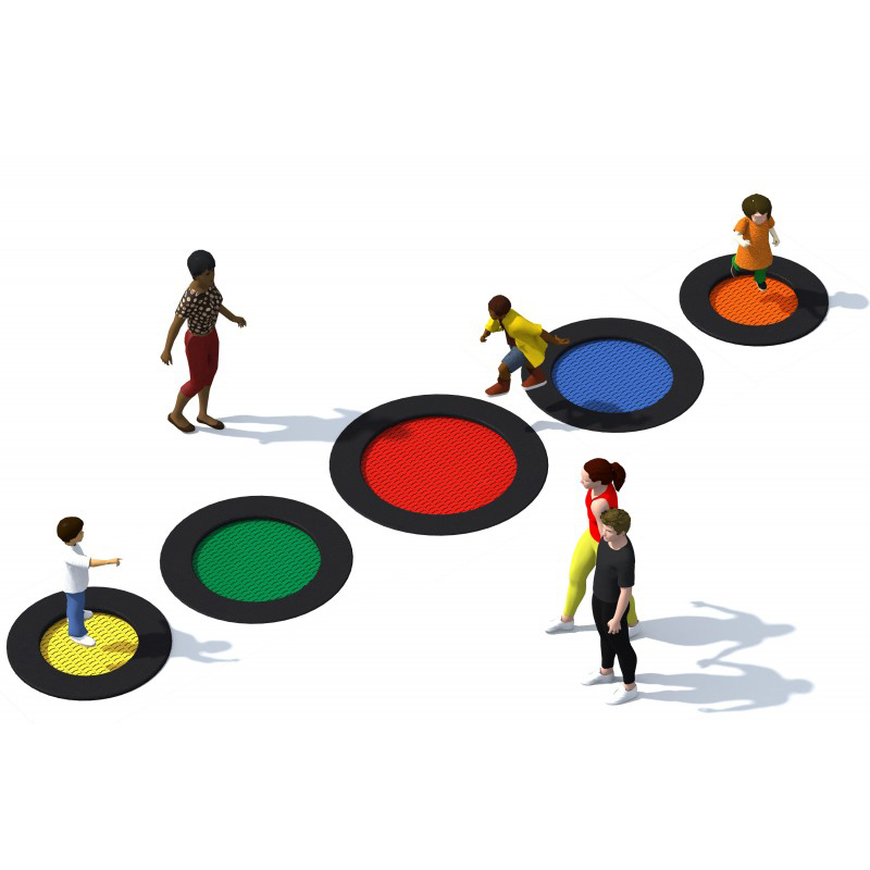 Set med 5 runda studsmattor avsedda för intensiv användning på lekplatser. Setet består av 2 RADO 125, 2 RADO 150 och 1 RADO 175. Hoppmattorna är tillverkade av mycket slitstarka Hercules-lameller med halkfri yta, V-formad överdel och förstärkta ribbor. Lamellavståndet på 7 mm förhindrar att små föremål faller ner i studsmattorna. Konstruktionen inkluderar fjädrar runt hela omkretsen, förstärkta kabelskydd, gummikrage samt metallboxstruktur. Mattorna finns i 8 färger och kan förses med grafik. Garantin omfattar 25 år för metalllåda och 3 år för lameller.