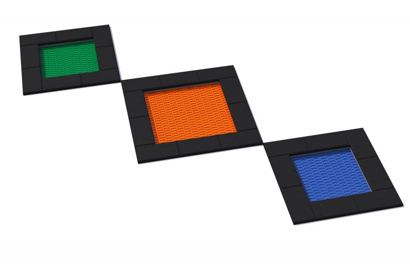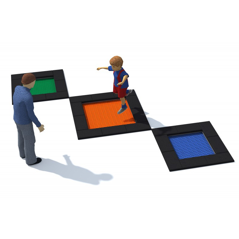 Set med 3 fyrkantiga studsmattor anpassade för intensiv användning på lekplatser. Hoppmattorna är tillverkade av slitstarka Hercules-lameller med en minsta bredd på 37 mm, V-form och förstärkta ribbor. Avståndet mellan lamellerna är endast 7 mm, vilket förhindrar att små föremål faller ner. Mattorna finns i 8 färger och kan även förses med grafik. Trampolinkragen av gummi finns i 2 standardfärger och 23 specialfärger samt kan dekoreras. Studsmattorna kan utrustas med öppningsbart lock. Garantin omfattar 25 år för metalllådor och 3 år för lameller.