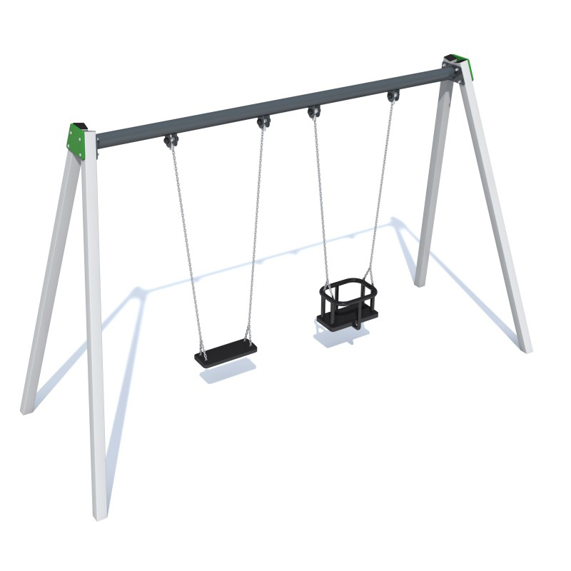 Orion 3 är en dubbelgunga som kombinerar en platt sits med en babyboxsits. Konstruktionen är tillverkad av galvaniserat stål och är anpassad för väderutsatt miljö och intensiv användning. Den enkla och klassiska designen gör gungan mångsidig och lättplacerad.