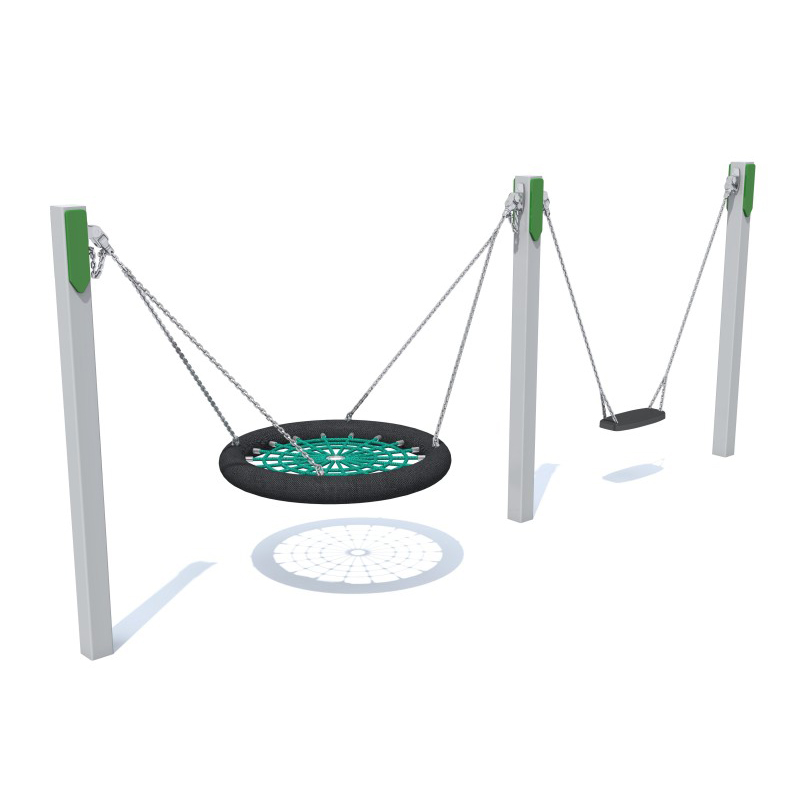 SUNON 2NS är en dubbelgunga som kombinerar en platt sits och en fågelbosits. Konstruktionen i galvaniserat stål ger lång hållbarhet och motståndskraft mot väder och slitage. Den klassiska utformningen har konstruktionsfärg RAL 9006 med gröna dekorer. Fågelbositsen finns i olika färger och den platta sitsen i svart.