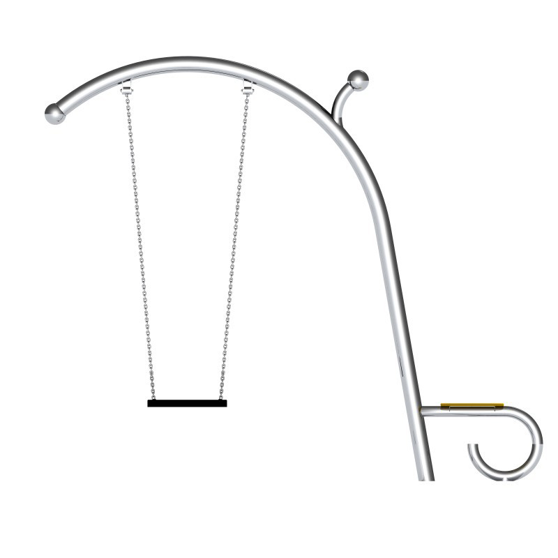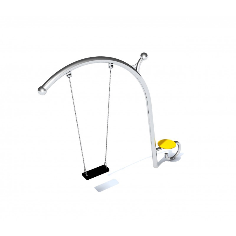 VERGO 1 är en enkelgunga med platt sits avsedd för en person och kompletteras med en bänk för förälder. Konstruktionen är tillverkad av rostfritt stål och bänken av HDPE-material. Designen är inspirerad av snigelns former och har dekorativa runda avslut som formar sniglar. Finns även i galvaniserad och pulverlackerad version.
