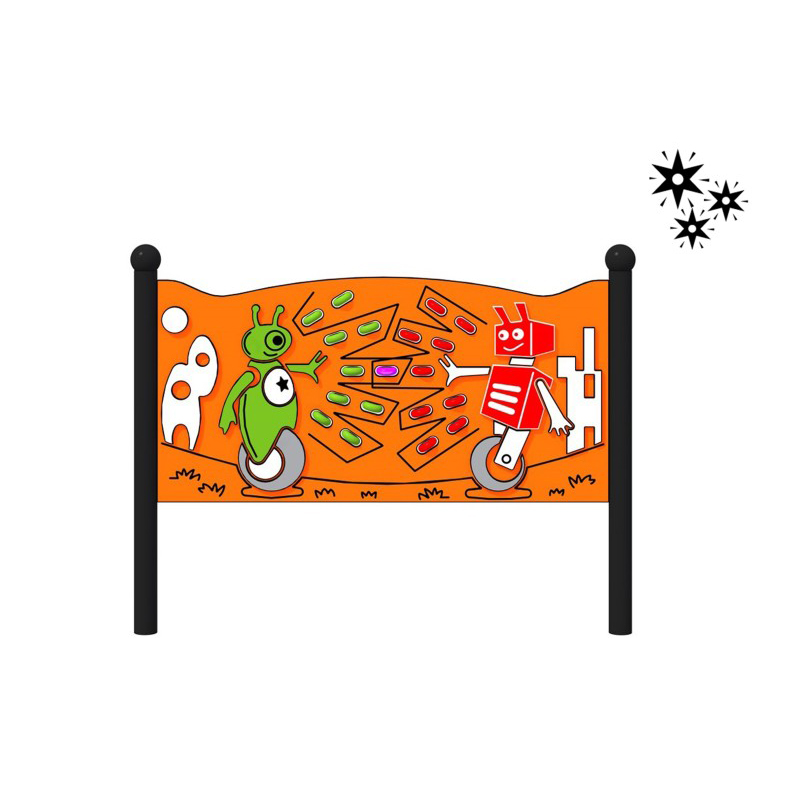 Stor sensorisk tavla designad för kreativ lek, anpassad för användning av barn i rullstol. Huvudtemat har två stridande robotar som skjuter strålar bestående av roterande hjul. Dessa hjul avger färgstarkt ljus när de sätts i rörelse, vilket gör spelupplevelsen mer engagerande. På vänster sida av brädan finns en rymdraket och på höger sida ett robothus. Längst ner finns skåror som imiterar växtlighet. Strukturen är gjord av svart stål, pulverlackerad för hållbarhet. Själva skivan är gjord av HDPE-plast. Rören är avslutade med dekorativa sfäriska element. * Tillgängliga stolpar färger [RAL]: 7016; 9006.