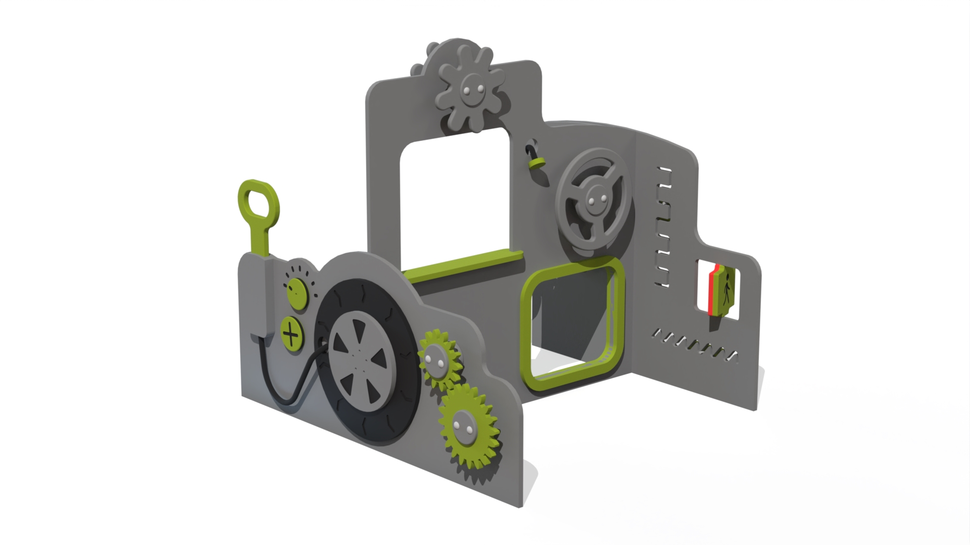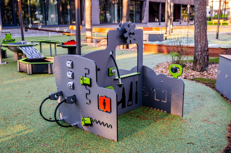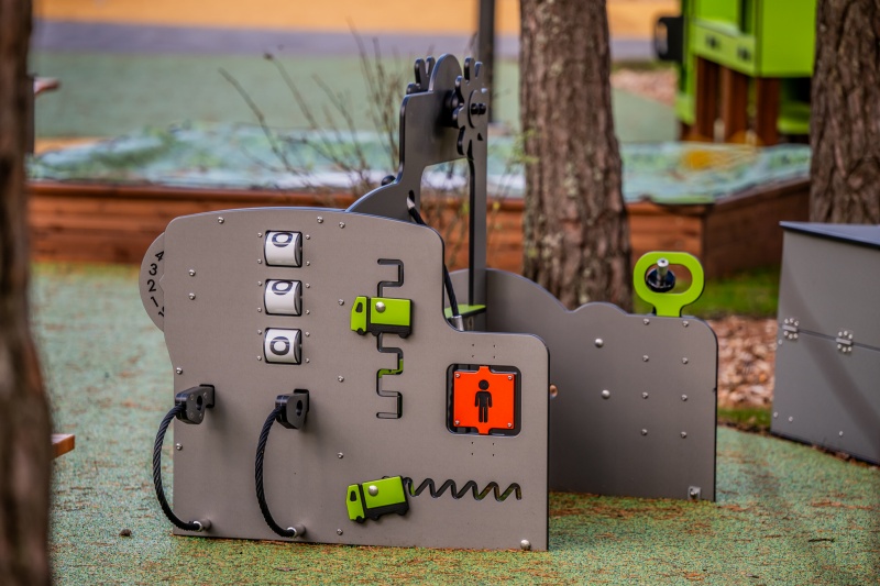 Lekutrustningen omfattar bland annat: en ratt, två roterande växlar, två stora kugghjul samt ett roterande trafikljus med gå- och stopp-symboler. Här finns även ett center för pumpning av bildäck med ett rörligt armstöd som fungerar som pump, inklusive slang som kan fästas på däcket.