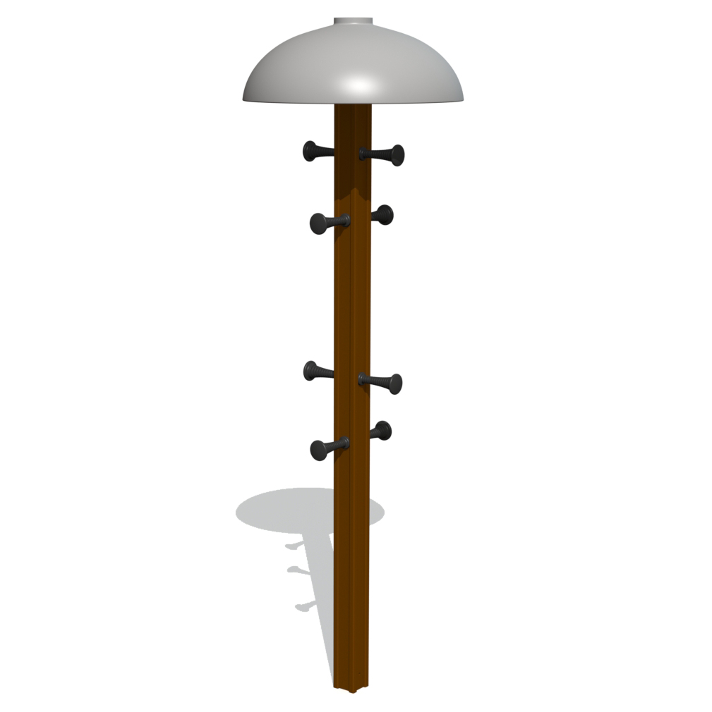 Litet svampformat stativ med plastpinnar i olika höjder för upphängning av kläder och väskor. Pinnarna har förstärkta kärnor och stativet är ingjutet i marken för stabilitet.