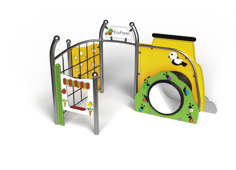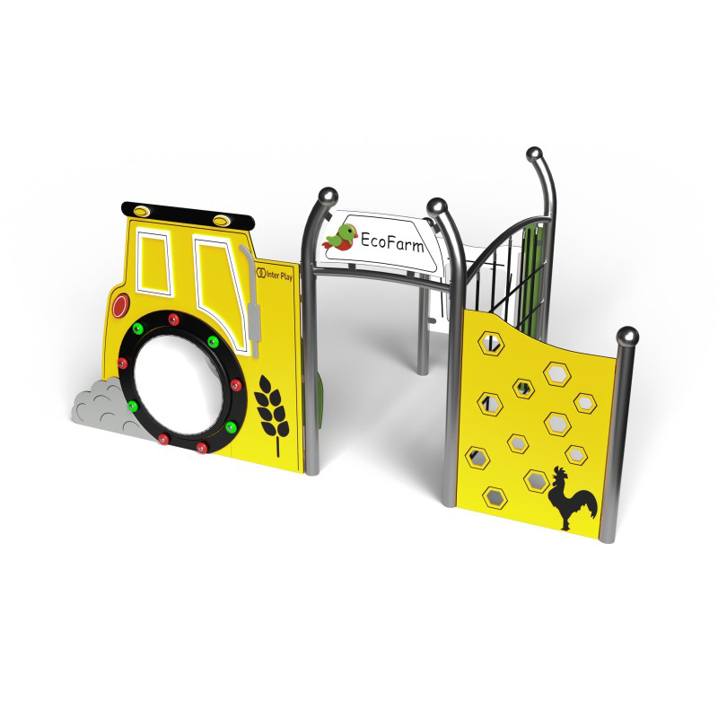 Tillgänglig temalekplats med bondgårdstema som kombinerar kreativ lek, lärande och socialt samspel. Lekmiljön är fullt anpassad för barn i rullstol och innehåller detaljer som grind, butikspanel, tunnel, klätterväggar och traktortema. Konstruktionen är tillverkad av rostfritt stål med rör i 76,1 mm diameter och 2 mm väggtjocklek. Paneler och dekorelement är gjorda av 15 mm HDPE. Rep är 16 mm tjocka med fiberkärna och stålfläta, UV-beständiga och flamskyddade. Roterande hjul med ljuseffekter förstärker den sensoriska upplevelsen.