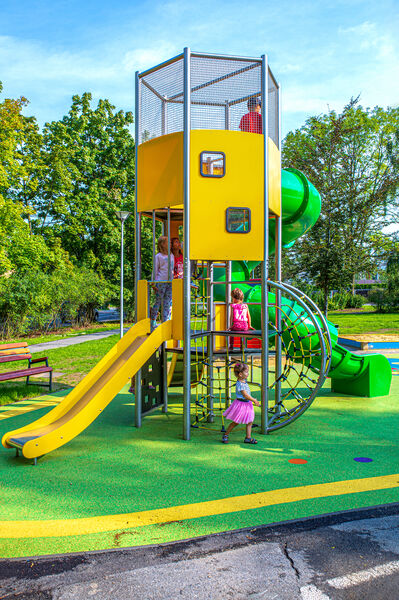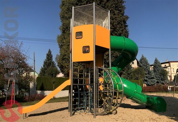 Stort torn med flera klättervägar och flera rutschkanor för varierad och aktiv lek. Konstruktionen uppmuntrar rörelse, balans och fysisk utveckling.