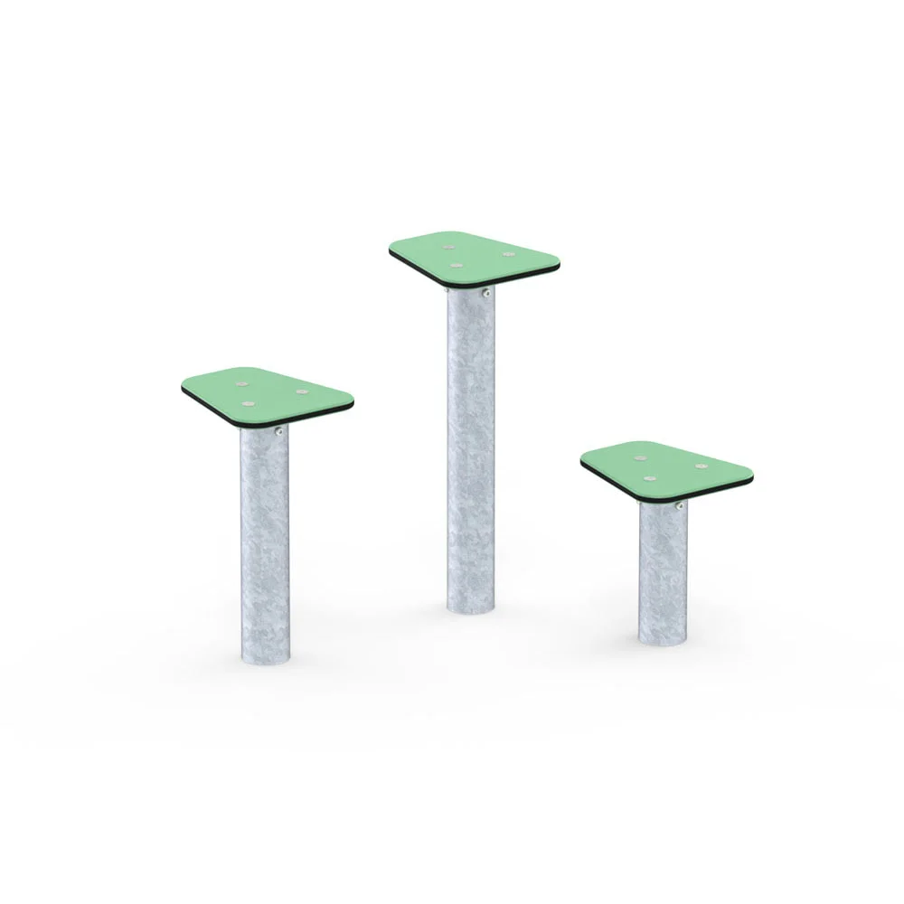 Trappstenar i olika höjder Trappstenarna i Basic-serien finns i olika höjder. LB041 är 28 cm, LB042 är 43 cm och LB043 är 58 cm. Alla har galvaniserade stålstolpar och ytor som kräver lite underhåll. Seriesortimentet av stegstenar och balansutrustning kan sättas ihop för att skapa en rolig hinderbana, eller så kan de användas individuellt som extradelar på lekplatsen. När barn använder sin förmåga att balansera och delta i lekar på balanseringsutrustningen, stimulerar de deras lillhjärna. Lillhjärnan styr muskelstyrkan som används när barn till exempel håller i en penna eller lyfter ett glas vatten, vilket gör det gynnsamt för deras vidare utveckling att delta i lekar som att golvet är gjort av lava. På samma sätt förbättrar speltaggen också barnens rumsliga medvetenhet, eftersom de hela tiden måste hålla ett öga på den som fångar dem och vart de ska gå härnäst. Kan monteras direkt på marken All balansutrustning kan monteras direkt på marken vilket gör att du inte behöver använda pengar på en säkerhetsyta. Utrustningen finns även i alla prisklasser och ger dig oändliga möjligheter, då du kan kombinera dem precis som du vill. Varför välja LEDON basic? Alla de grundläggande elementen du behöver för en lågkvalitativ lekplats till låga priser. Kompakta torn, som kräver lite utrymme. Systemen finns i en mängd olika varianter för att möta alla behov. Att tillhandahålla grundläggande motoriska utmaningar är av största vikt – det är också en lekplats för äldre barn. Kan enkelt integreras i både befintliga lekmiljöer eller kombineras med våra andra temavärldar.