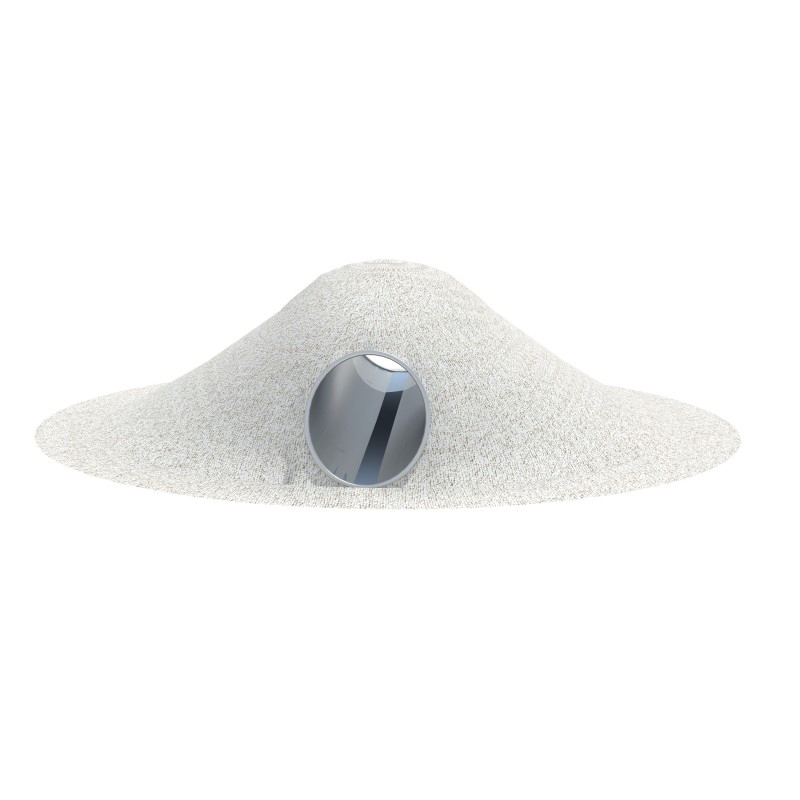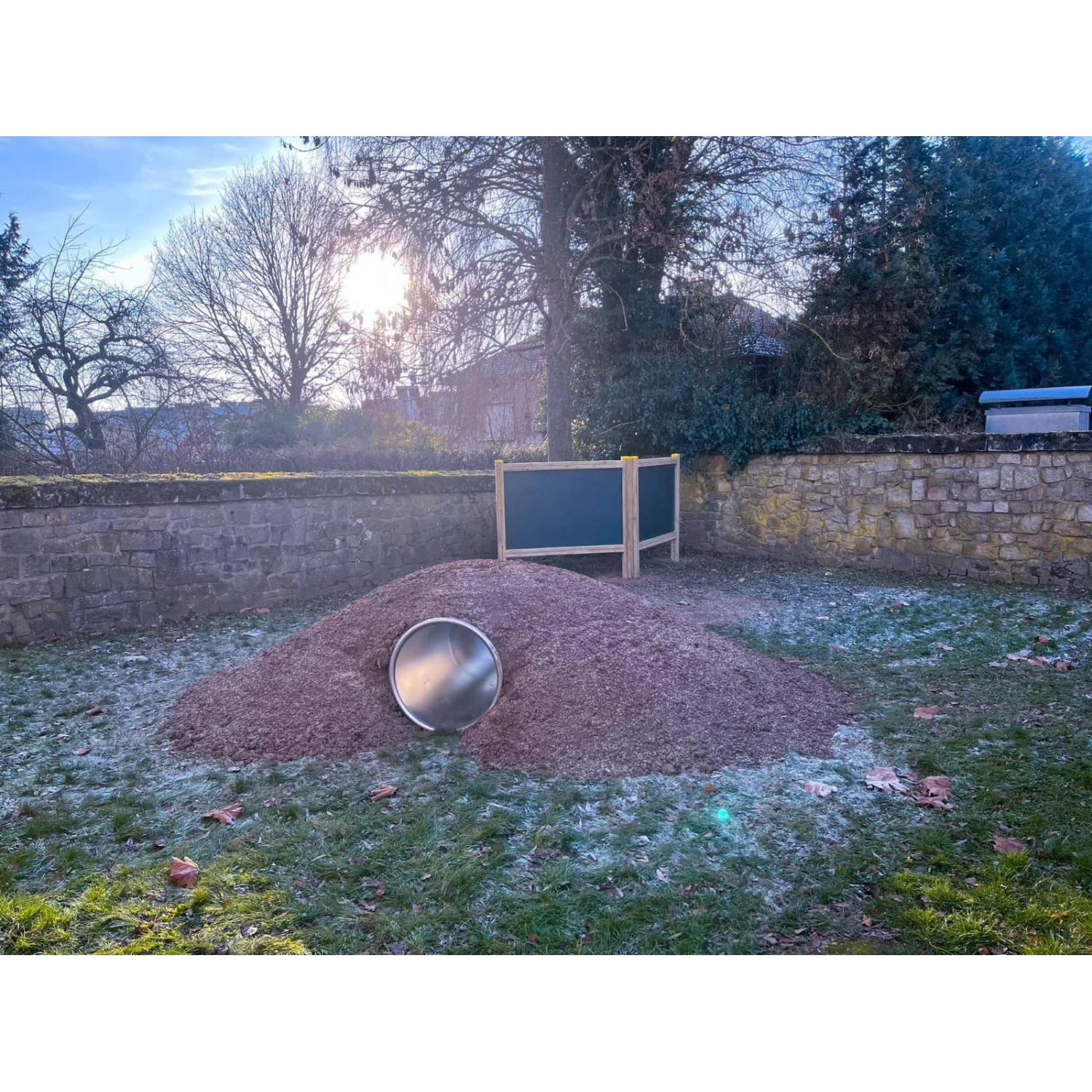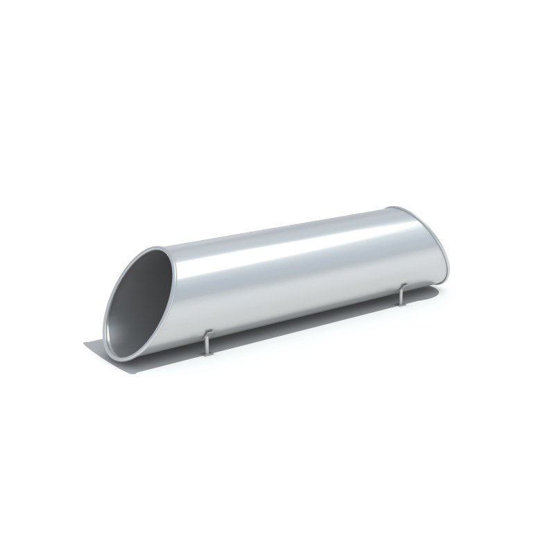 Tunnelrör i cirkulär form för installation i naturliga eller anlagda vallar. Rutschkanans längd är 2,50 m och diametern 0,85 m. In- och utgång är skurna i 30° vinkel mot tunnelns axel. Tunneln är helt tillverkad av matt rostfritt stål.