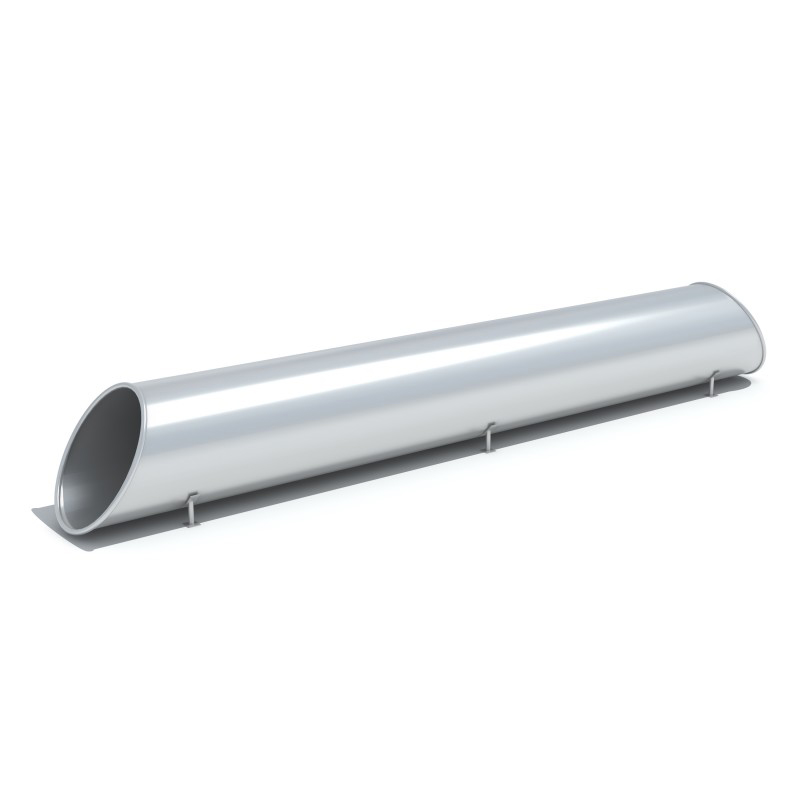 Tunnelrör i cirkulär form för installation i naturliga eller anlagda vallar. Rutschkanans längd är 5,00 m och diametern 0,85 m. In- och utgång är skurna i 30° vinkel mot tunnelns axel. Tunneln är helt tillverkad av matt rostfritt stål.