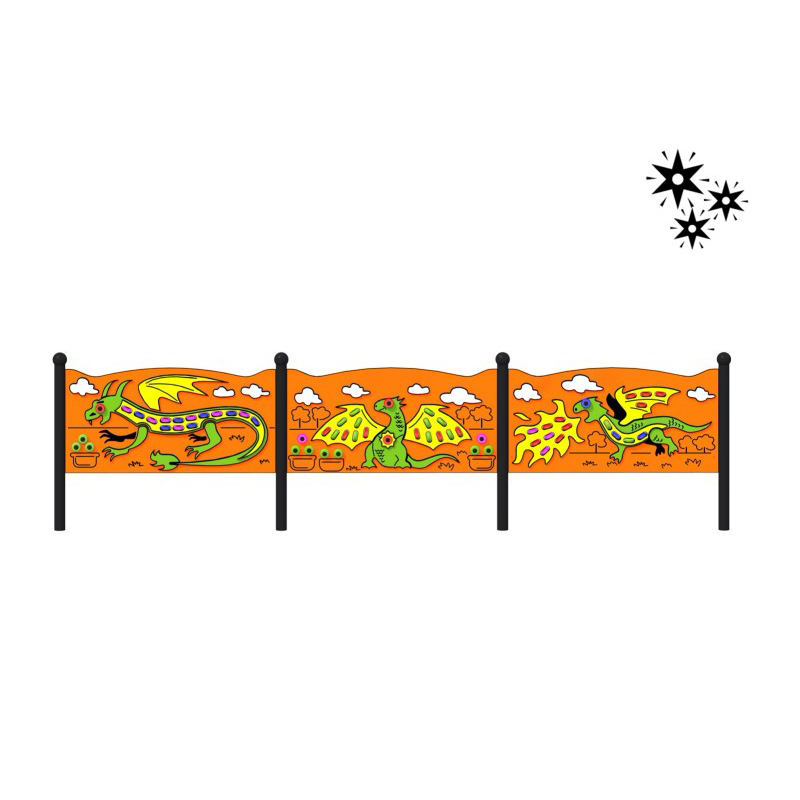 Set med tre sammankopplade sensoriska paneler designade för inkluderande lek. Med olika texturer, färger och engagerande detaljer stimuleras sinnena och barns fantasi. Huvudtemat är drakar som tar barnen med in i en sagovärld. Roterande hjul avger färgstarkt ljus när de sätts i rörelse. I bakgrunden finns snidade detaljer som föreställer växtmotiv och moln. Strukturen är gjord av svart, galvaniserat och pulverlackerat stål. Panelerna är tillverkade av HDPE-material och rören är avslutade med dekorativa sfäriska element. * Tillgängliga stolpfärger [RAL]: 7016; 9006.