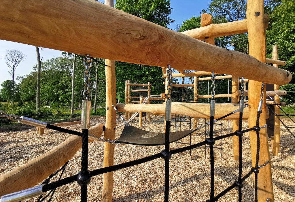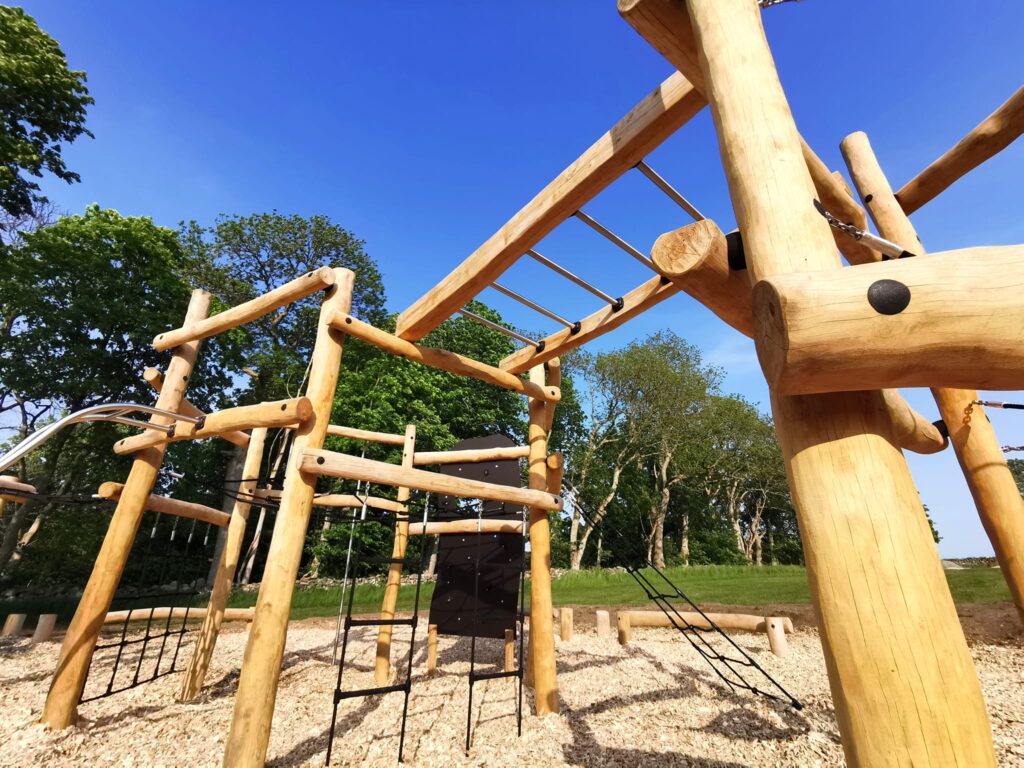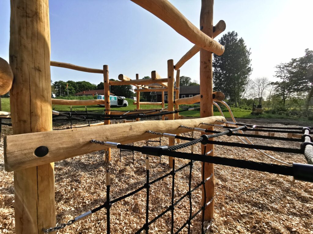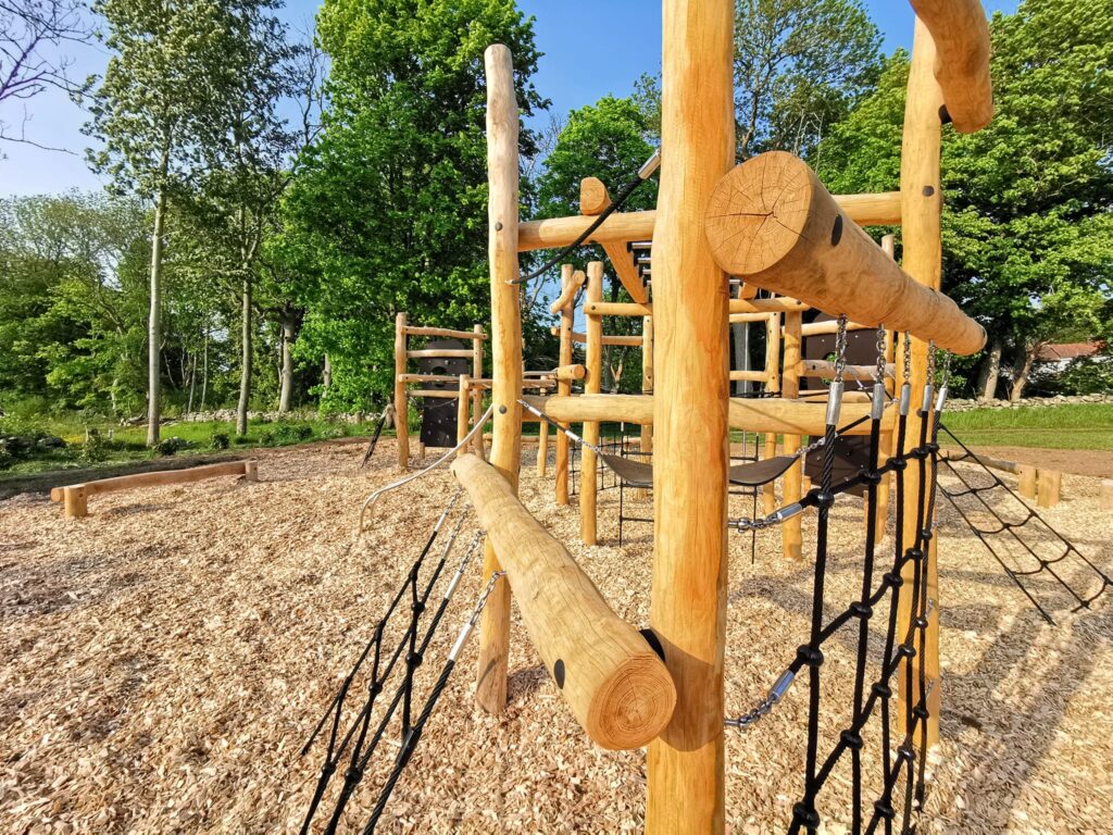 Nedan bilder från tidigare utförda installation hos Vallda pastorat – en hinderbana i robiniaträ på träflisunderlag.